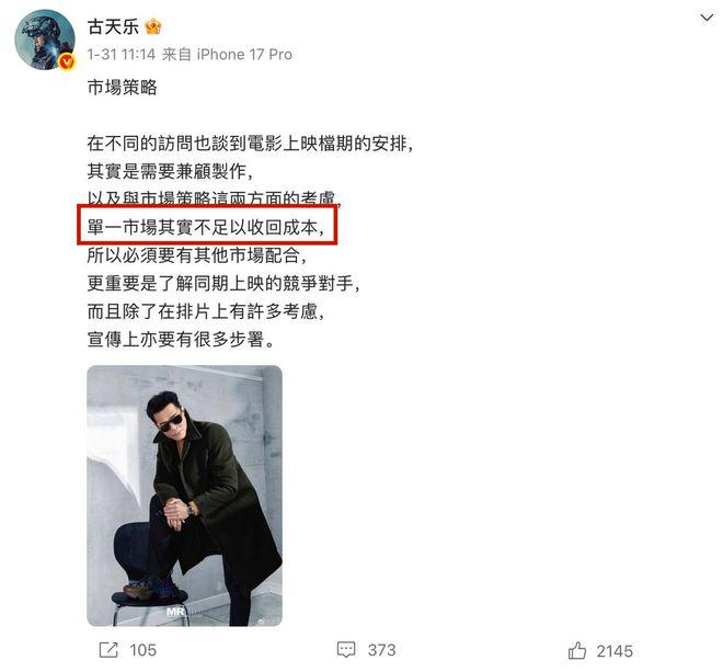 古天乐在自己的社交平台大方承认,单一市场其实不足以收回成本。